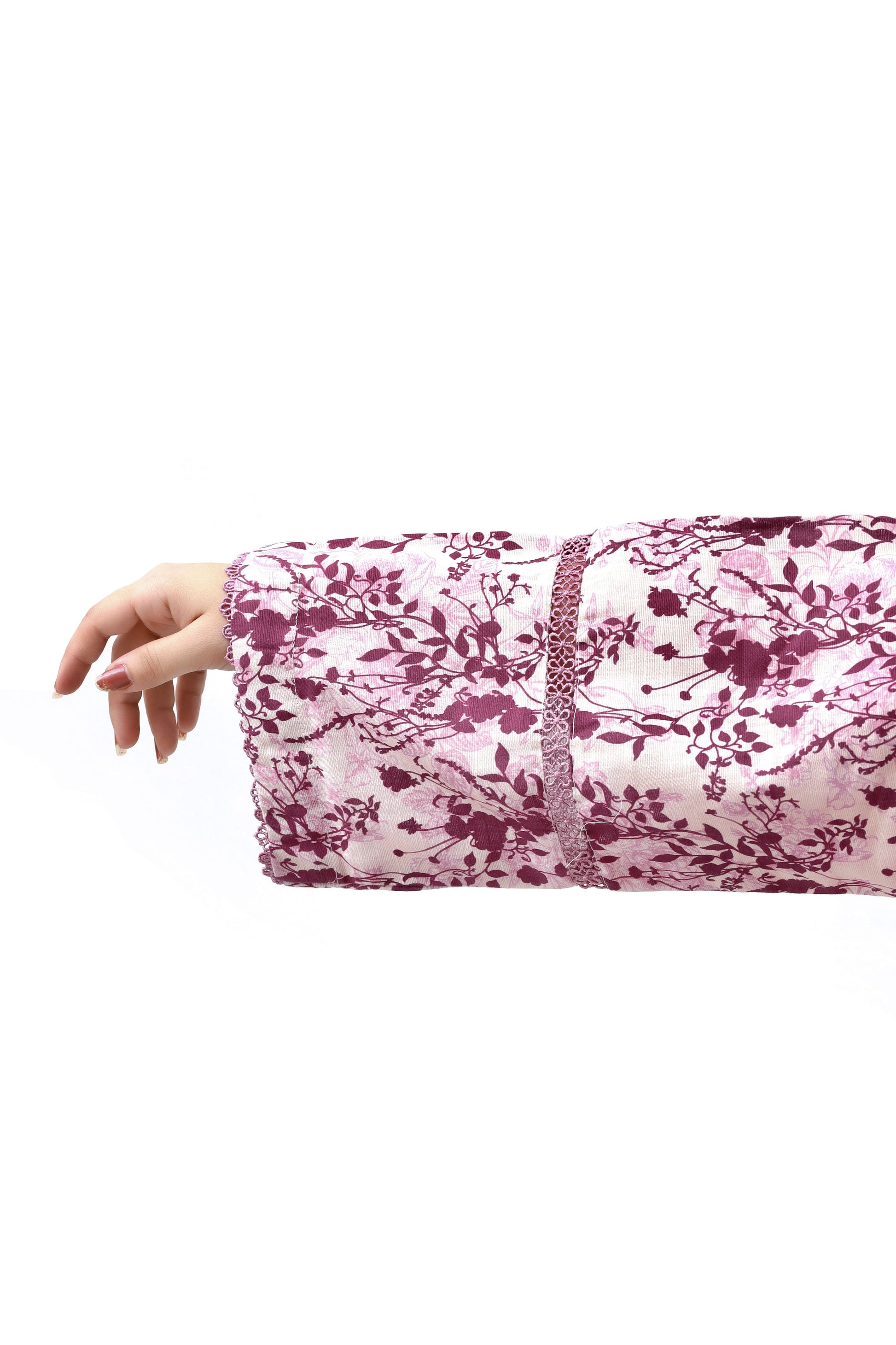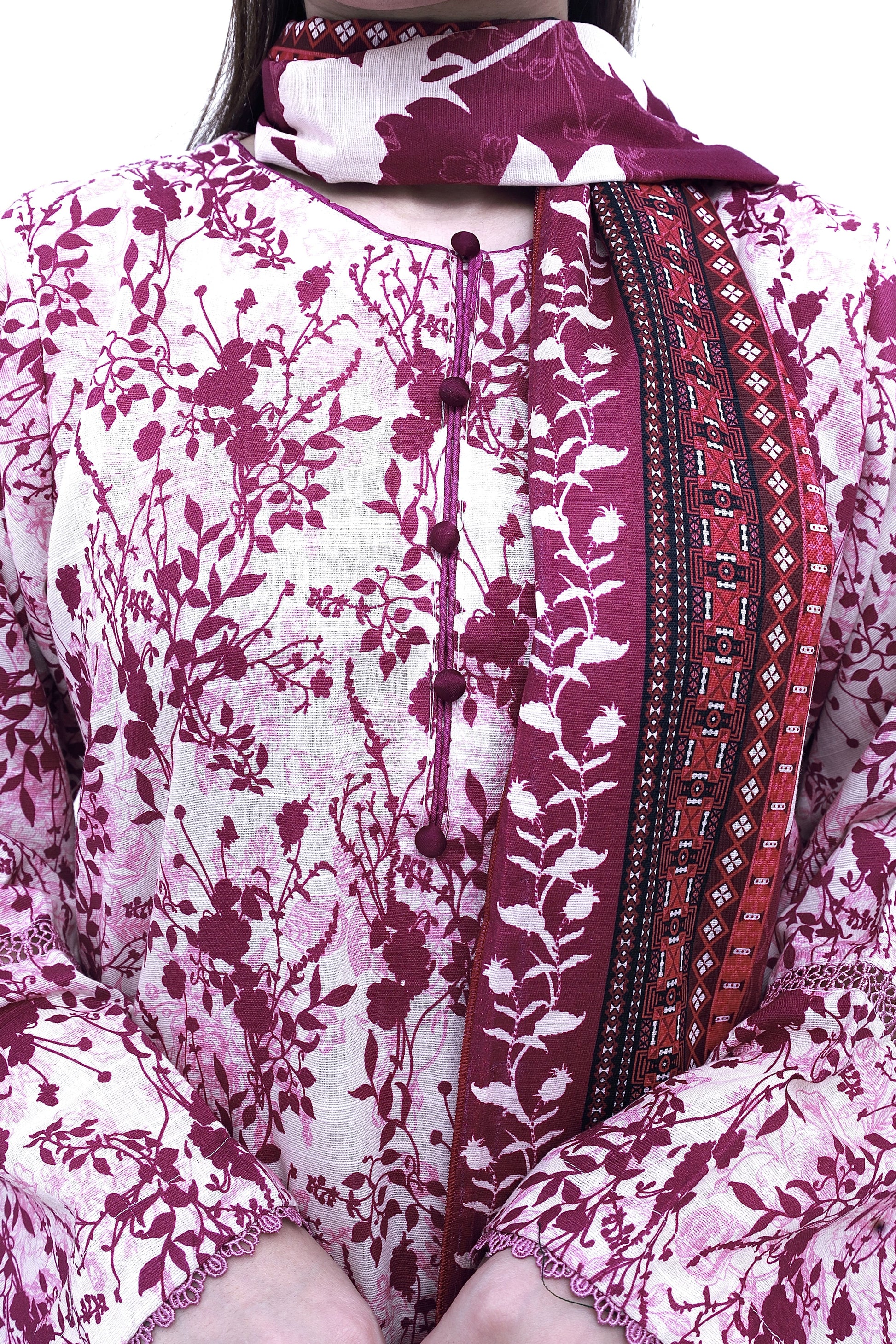 Embrace refined style with ALEENA — a gracefully printed 3-piece Khaddar ensemble. Crafted from warm, comfortable Khaddar fabric, this suit features a beautiful plum and cream floral and paisley print.