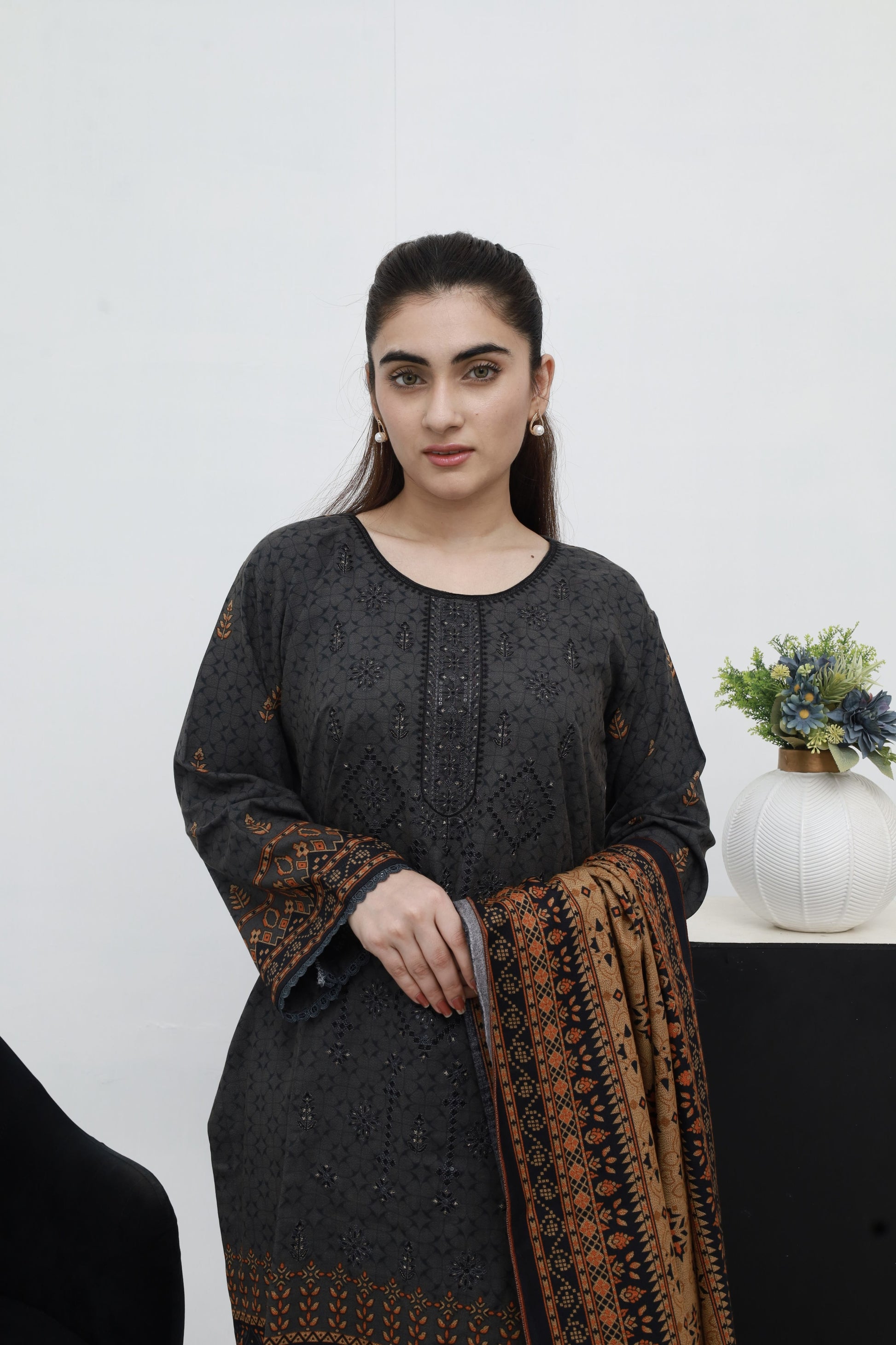 Elevate your cool-weather style with ALISHBA— an exquisite 3-piece Dhanak suit. Crafted from premium, warm Dhanak in a chic dark grey base, the shirt features an intricately embroidered front.