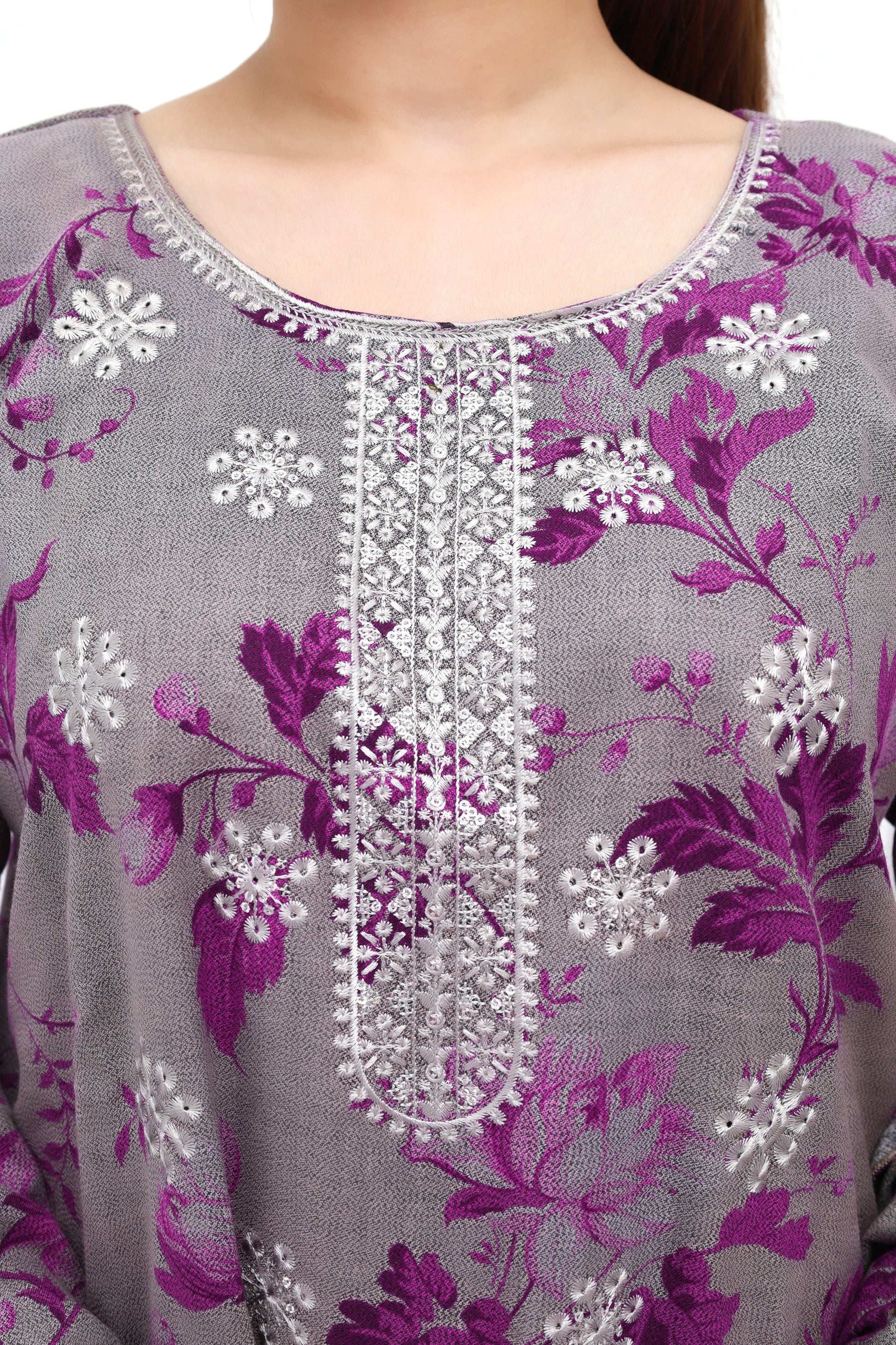 Elevate your winter style with DUA, a stunning 3-piece Dhanak suit. Crafted from premium, warm fabric, the vibrant floral print is richly detailed with comprehensive embroidery. The shirt features a fully embroidered front, complemented by intricate embroidery on the neckline and a stunning embroidered panel accenting the hem. Delicate drop tassels finalize the look with subtle movement and luxury.