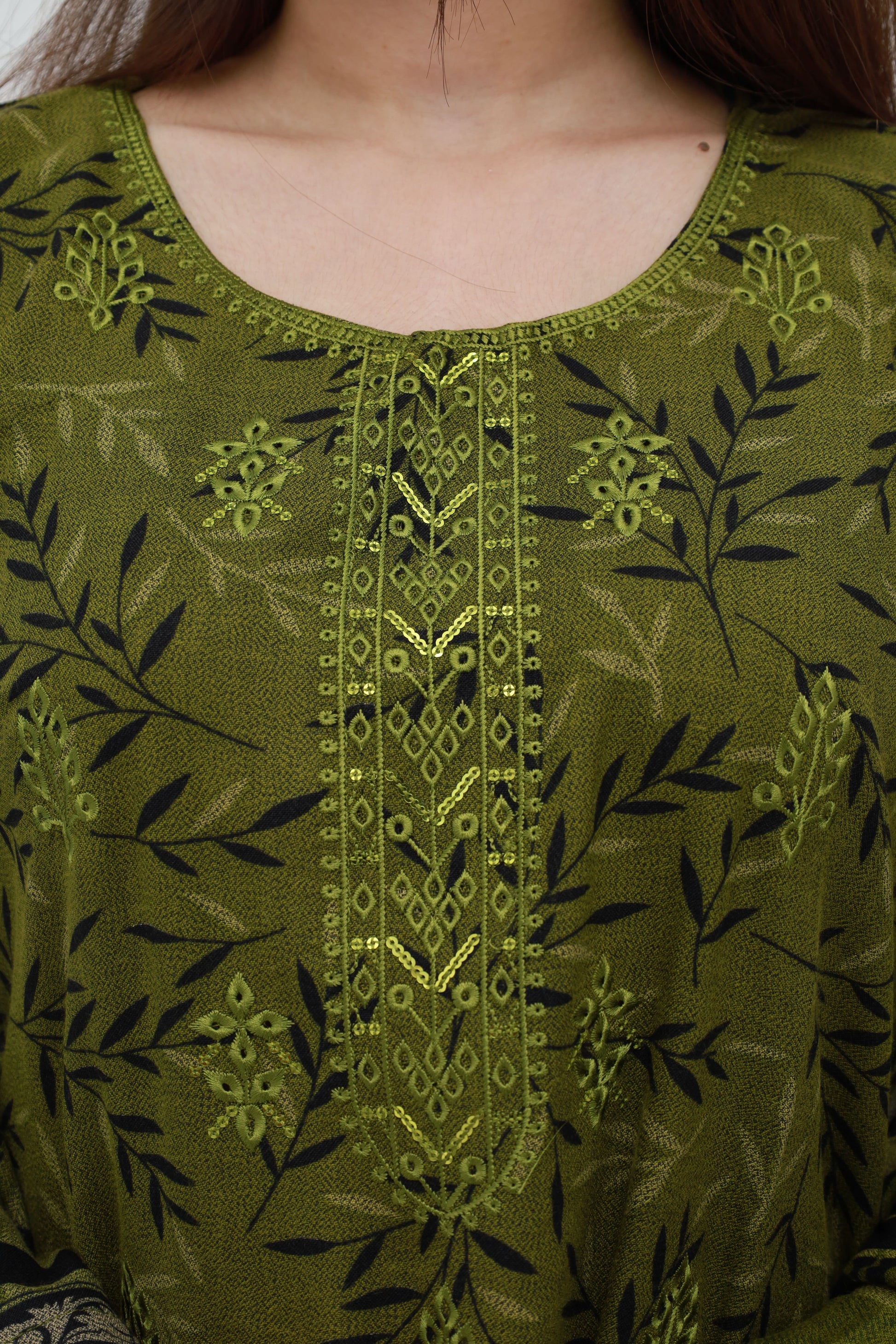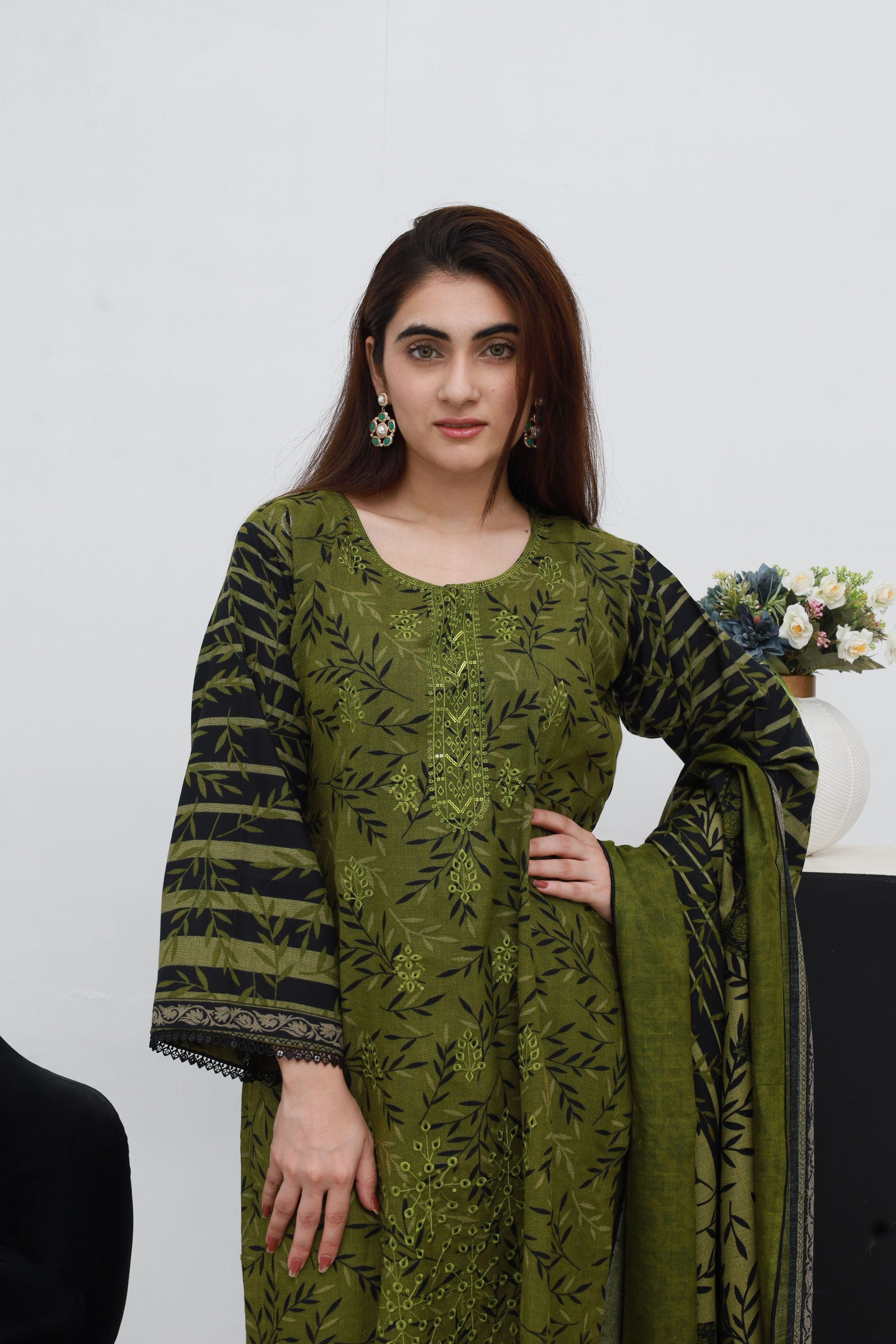 Embrace refined elegance with Umama — a gracefully embroidered 3-piece ensemble crafted from luxurious Dhanak fabric in a rich olive hue. Adorned with delicate embroidery on the front, and finished with lace detailing on the hem and sleeves, this design reflects timeless sophistication.